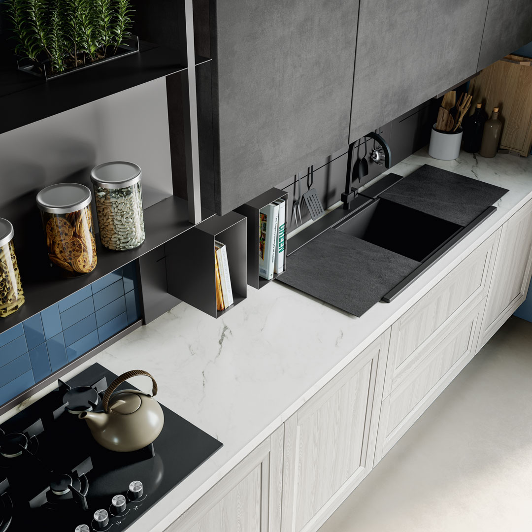 Scopri “Smart” di Creo Kitchens, la cucina su misura che reinterpreta il design d’arredo con un approccio moderno e funzionale. Perfetta per giovani coppie e famiglie dinamiche, questa soluzione d’arredamento moderno combina eleganza e praticità con materiali di alta qualità come il legno laminato per le superfici e il quarzo per i piani di lavoro, garantendo resistenza e facilità di manutenzione. Gli inserti in acciaio inox donano un tocco di raffinatezza e durata nel tempo. Grazie alla sua modularità, “Smart” si adatta a ogni spazio, trasformando la tua cucina in un ambiente accogliente e personalizzato. Vivi l’innovazione con Creo Kitchens e rivoluziona il tuo modo di vivere la cucina.